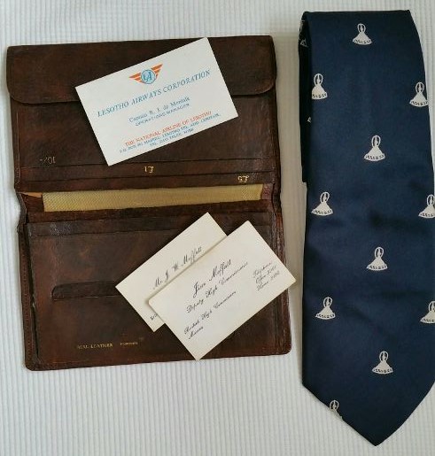 Jim's wallet and neck tie showing the native head dress, the Basotho 'mokorotlo', emblem of Lesotho |